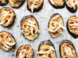 The idea is very simple, it’s about making some bases with eggplant, and filling them with marinated chicken, gratinating them and enjoying.