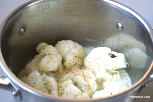 • Pour in the broth and bring to a gentle boil. Cook for 20 minutes, until cauliflower is tender.