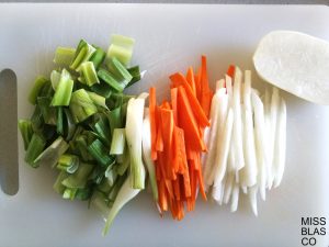 - Ahora es el momento de cortar el resto de verduras, cuanto más finas mejor, también puedes rallarlas.