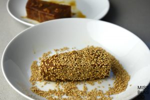 • Cuando el atún esté bien marinado y reposado, ya puedes pasar a cocinarlo. Corta los lomos en trozos rectangulares alargados, elimina los trozos de ajo y jengibre que se hayan pegado al pescado, para evitar que se quemen al pasarlo por la plancha. Reboza cada trozo en las semilla de sésamo tostado.