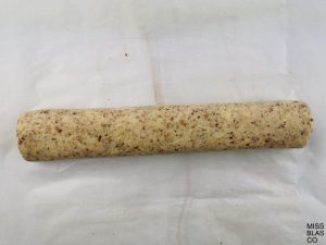 - Prepara una bandeja de horno, pon un papel de horno sobre ella y pon la bola de masa encima, amasa formando un cilindro, lo más regular posible.