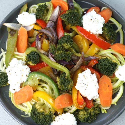 Assemble the Salad: On a large platter or in individual bowls, layer the spiralized zucchini as the base. Arrange the sautéed peppers, poached red onion, steamed broccoli, and carrots on top. Sprinkle with the cottage cheese for a creamy, fresh touch.